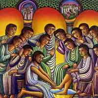Durante la Cena, cuando el demonio ya había inspirado a Judas Iscariote, hijo de Simón, el propósito de entregarlo, sabiendo Jesús que el Padre había puesto todo en sus manos y que Èl había venido de Dios y volvía a Dios, se levantó de la mesa, se sacó el manto y tomando una toalla se la ató a la cintura. Luego echó agua en un recipiente y empezó a lavar los pies a los discípulos y a secárselos con la toalla que tenía en la cintura.