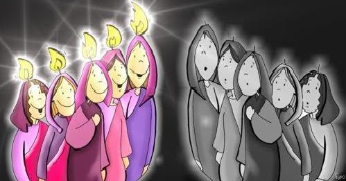 Jesús contó a sus amigos esta historia: «Había una boda, y era costumbre que un grupo de mujeres esperasen al novio en la puerta, con lámparas encendidas. Diez mujeres fueron a esperarlo. Cinco de ellas eran prudentes, y habían llevado suficiente aceite para las lámparas. Otras cinco eran descuidadas, y casi no llevaron aceite. Como el novio tardaba en llegar, estas últimas se quedaron sin aceite y tuvieron que volver a sus casas a por más. Pero justo cuando estaban lejos llegó el novio, así que invitó a las cinco que ya estaban a entrar a la fiesta. Cuando las otras regresaron, todo el mundo estaba en la fiesta y no pudieron entrar porque la puerta estaba cerrada y porque habían sido descuidadas».
