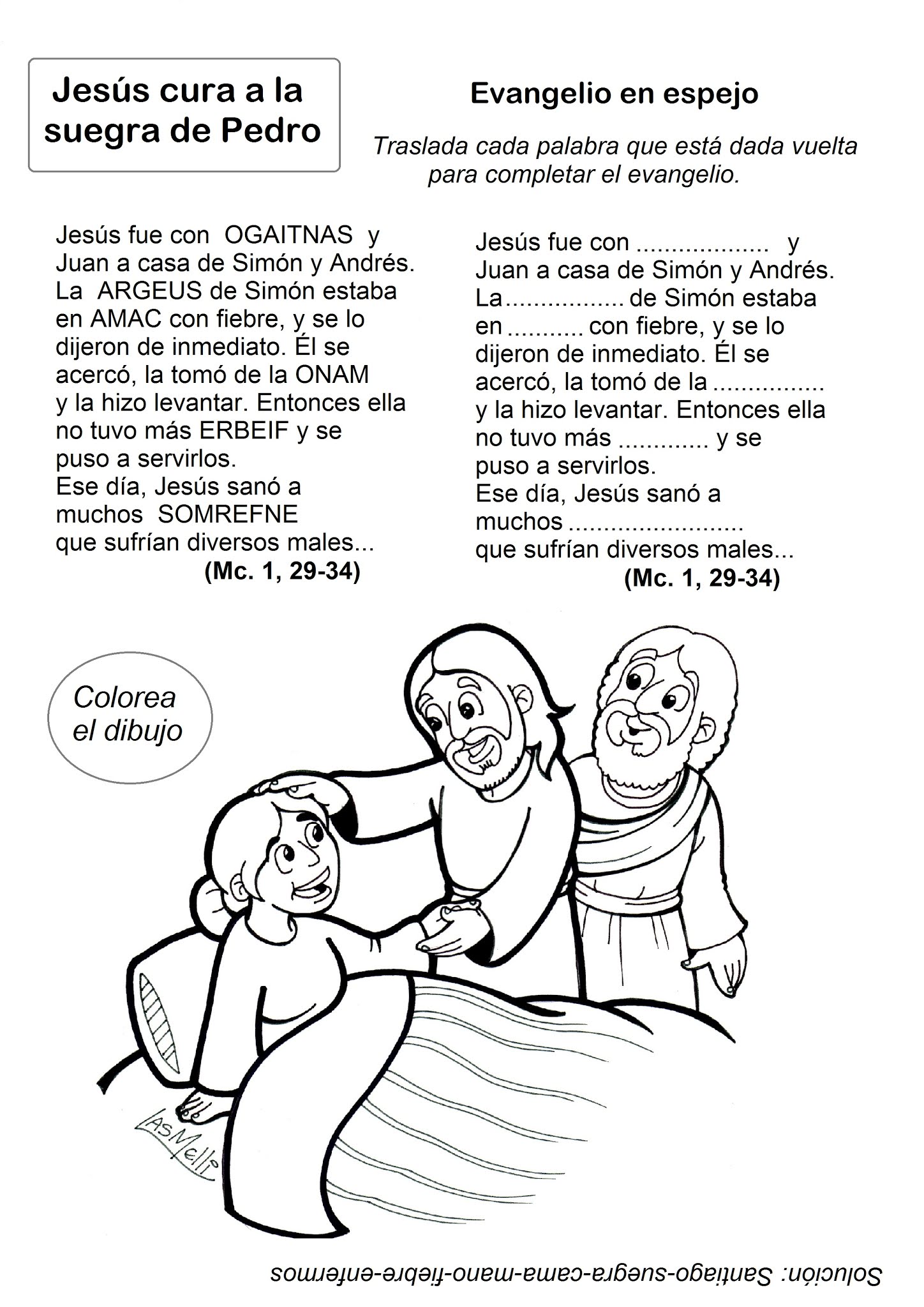 Un día, Pedro invitó a Jesús y a sus amigos a comer a su casa. Pero con tan mala suerte que, cuando llegaron, la suegra de Pedro se había puesto enferma. Y ella era la que en la casa hacía todo. Vaya fastidio. El pobre Pedro, que era más bien un chapuzas para las cosas del hogar, estaba muy apurado, y además muy triste por su suegra. Pero Jesús, nada más llegar, la tomó de la mano y la curó. Fue una fiesta. Claro, todo el mundo se enteró, así que empezaron a llegar enfermos de todas partes para que les sanase. Y Jesús iba atendiendo a todos.