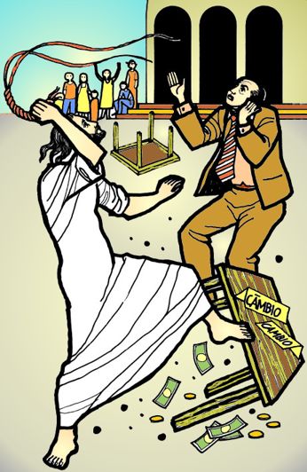 Se acercaba la Pascua de los judíos. Jesús subió a Jerusalén y encontró en el Templo a los vendedores de bueyes, ovejas y palomas y a los cambistas sentados delante de sus mesas. Hizo un látigo de cuerdas y los echó a todos del Templo, junto con sus ovejas y sus bueyes; desparramó las monedas de los cambistas, derribó sus mesas y dijo a los vendedores de palomas: «Saquen esto de aquí y no hagan de la casa de mi Padre una casa de comercio».
