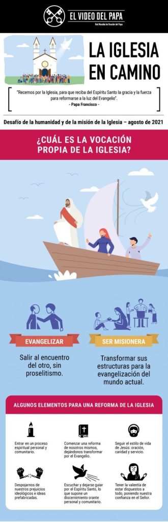 (Ciudad del Vaticano, 3 de agosto de 2021) – Acaba de publicarse El Video del Papa con la intención de oración que Francisco confía a toda la Iglesia Católica a través de la Red Mundial de Oración del Papa. En este mes de agosto, el Santo Padre hace una reflexión profunda sobre la situación de la Iglesia, su vocación, su identidad y llama a renovarla “desde el discernimiento de la voluntad de Dios en nuestra vida diaria”. Para Francisco, en tiempos de crisis y dificultades, la Iglesia necesita una reforma que tiene que comenzar con la “reforma de nosotros mismos” y “a la luz del Evangelio”.