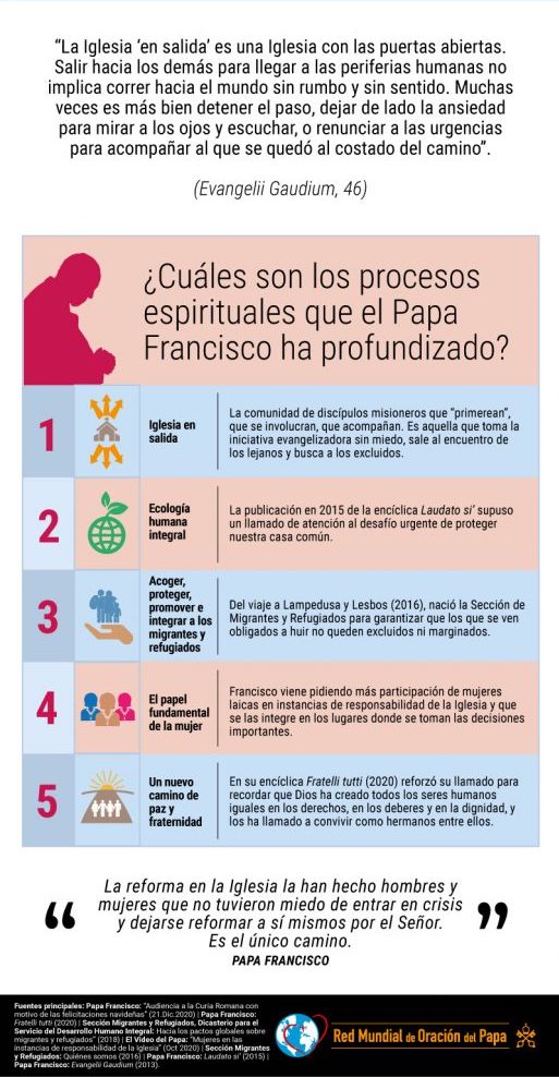 Como explicó en la Exhortación Apostólica Evangelii Gaudium: “Cada cristiano y cada comunidad discernirá cuál es el camino que el Señor le pide, pero todos somos invitados a aceptar este llamado: salir de la propia comodidad y atreverse a llegar a todas las periferias que necesitan la luz del Evangelio”.[1]