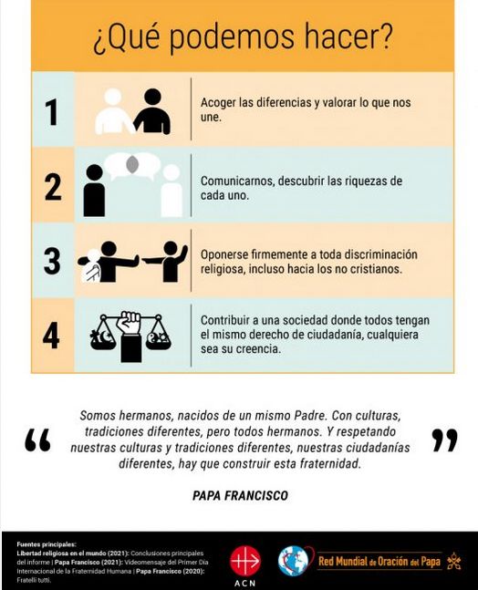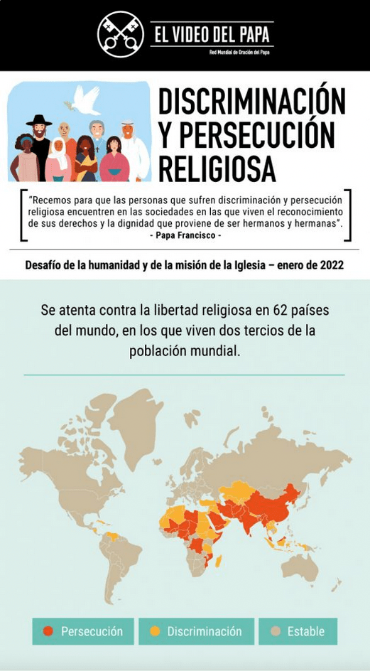 El P. Frédéric Fornos S.J., Director Internacional de la Red Mundial de Oración del Papa, comentó a propósito de esta intención: “Francisco nos ha dado una brújula con su encíclica Fratelli Tutti: la fraternidad humana. Pues como dijo también en su mensaje para el primer Día Internacional de la Fraternidad Humana, ‘Hoy la fraternidad es la nueva frontera de la humanidad. O somos hermanos, o nos destruimos mutuamente’. Para ello es importante reconocer lo que duele a la fraternidad, para poder sanarla y evitar que se traduzca en discriminación y persecución religiosa, como tantas veces acontece, en particular contra los cristianos. Recemos por esta intención de oración con todo nuestro corazón: ‘para que todas las personas que sufren discriminación y persecución religiosa encuentren en las sociedades en las que viven el reconocimiento de sus derechos y la dignidad que proviene de ser hermanos y hermanas’”.