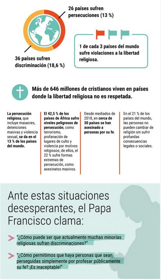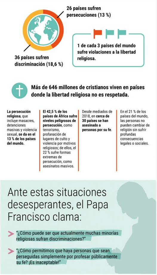 En su primera intención de oración del 2022, Francisco abre con dos preguntas directas, incisivas y que claman respuesta: “¿Cómo puede ser que actualmente muchas minorías religiosas sufran discriminaciones? ¿Cómo permitimos que haya personas que sean perseguidas simplemente por profesar públicamente su fe?”. En efecto, según revela el “Informe de Libertad Religiosa en el Mundo” publicado por ACN en abril de 2021, la libertad religiosa se vulnera en un tercio de los países del mundo en los cuales viven cerca de 5.200 millones de personas[1]. El mismo informe expone que más de 646 millones de cristianos viven en países donde la libertad religiosa no es respetada.