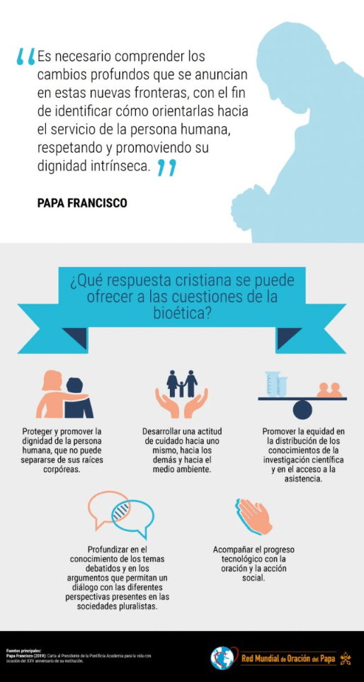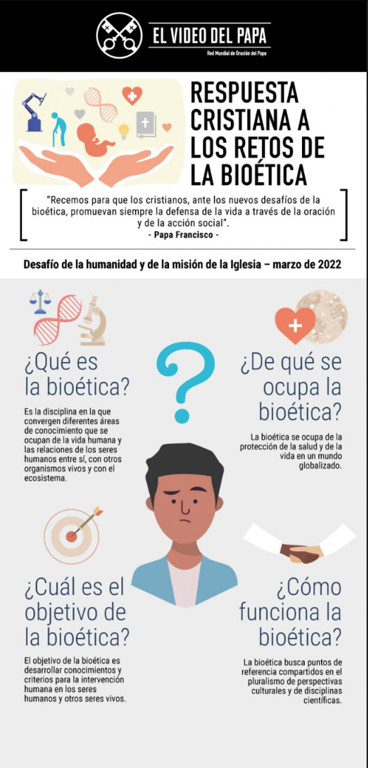 El P. Frédéric Fornos S.J., Director Internacional de la Red Mundial de Oración del Papa, comentó a propósito de esta intención: “Papa Francisco siempre insiste en la necesidad de un mayor discernimiento para los desafíos de la bioética, sobre la necesidad de respetar la vida humana y de ninguna manera buscar sus propios intereses, en lógicas de mercado que no tienen límites. Son necesarios criterios de discernimiento que ayuden a salir de una cultura del descarte y promuevan el respeto de la vida en sentido integral, todo lo largo de la vida humana, del nacimiento a la muerte. Oremos para que ante los nuevos desafíos de la bioética podamos promover siempre, con la oración y la acción social, la defensa de la vida”.