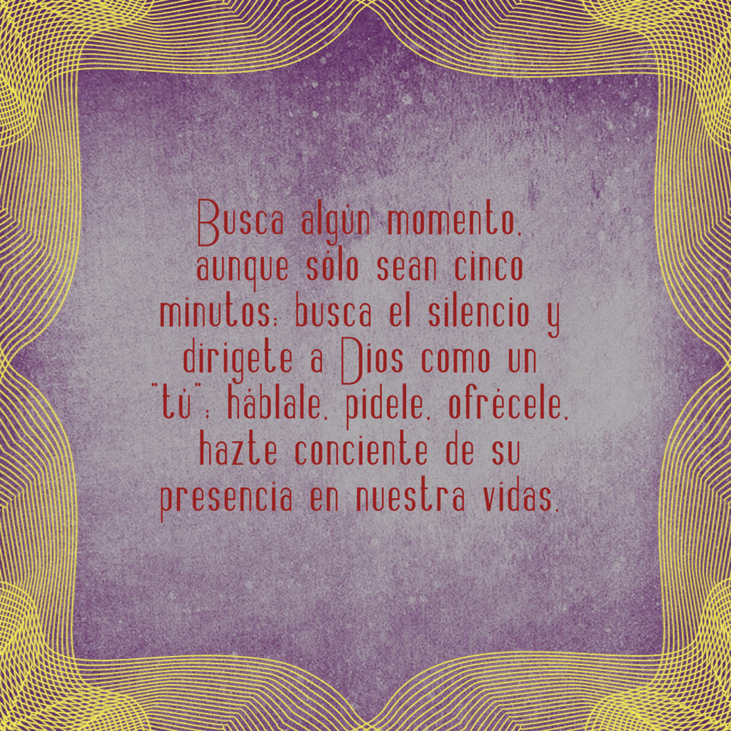 Se trata de buscar espacios en los que dirigirnos a El, desde el silencio, como un “Tú”. Hay quien lo hace desde oraciones ya hechas, mientras otros buscan palabras propias. Hay quien le habla de su vida; quien pide, quien ofrece, quien pregunta, quien agradece… A veces te apoyas en textos, y esos textos te pueden resonar de modo distinto, y tal vez ahí percibes que Dios te toca de un modo distinto. La oración no es una condena ni una obligación, sino aprender a hablar a Dios en segunda persona, y a sentir que, con El, uno no está solo.