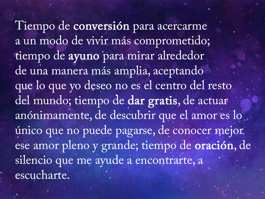 Estarme en gratuidad contigo, aquí y ahora, atento a tu palabra, entero y presente en ella. Quiero unificar mi ser y ser en tu ser, y poner en tus manos el pan y el pez de mi cesta, sin pensar. Unir mi vida con la tuya Señor, al rescoldo de las brasas, tras la fatigosa pesca. Tú eres la última palabra, la mejor palabra, acogida en el silencio de una dura experiencia. Tú eres Buena Noticia que alegra el corazón y que levanta el vuelo en búsqueda de estrellas. Eres como el silencio de las noches frías que gota a gota empapa esta arena seca del desierto. Y sigo aquí Señor, lleno de ruidos. Quiero silencio para escuchar tu palabra desde el corazón que anhela unos brazos y desea volver de nuevo al origen, al paraíso, para al caer de la tarde, encontrarme con tu presencia.