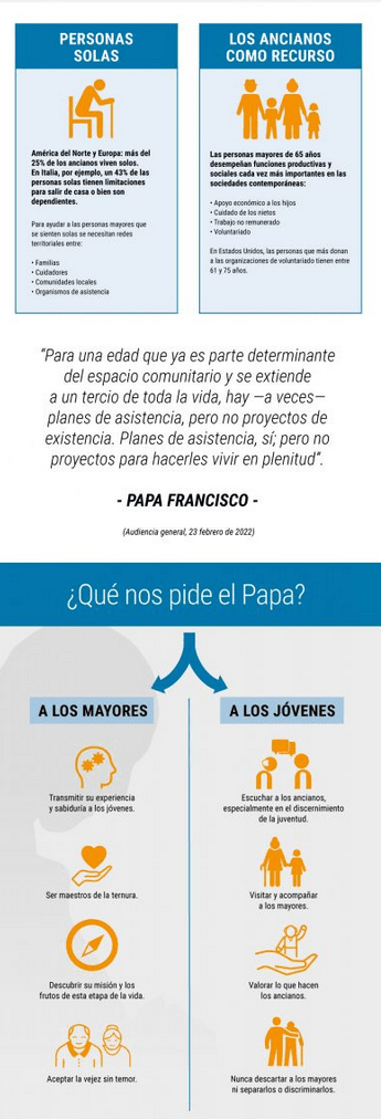 La profecía de los ancianos se cumple cuando la luz del Evangelio entra plenamente en sus vidas; cuando, como Simeón y Ana, toman a Jesús en sus brazos y anuncian la revolución de la ternura, la Buena Nueva de Aquel que vino al mundo para traer la luz del Padre. La vejez no es una enfermedad, es un privilegio. La soledad puede ser una enfermedad, pero con caridad, cercanía y consuelo espiritual podemos curarla. […] Dios tiene un pueblo numeroso de abuelos en todo el mundo. Hoy en día, en las sociedades secularizadas de muchos países, las generaciones actuales de padres no tienen, en su mayoría, la formación cristiana y la fe viva que los abuelos pueden transmitir a sus nietos. Son el eslabón indispensable para educar a los niños y a los jóvenes en la fe. Debemos acostumbrarnos a incluirlos en nuestros horizontes pastorales y a considerarlos, de forma no episódica, como uno de los componentes vitales de nuestras comunidades. No sólo son personas a las que estamos llamados a ayudar y proteger para custodiar sus vidas, sino que pueden ser actores de una pastoral evangelizadora, testigos privilegiados del amor fiel de Dios.