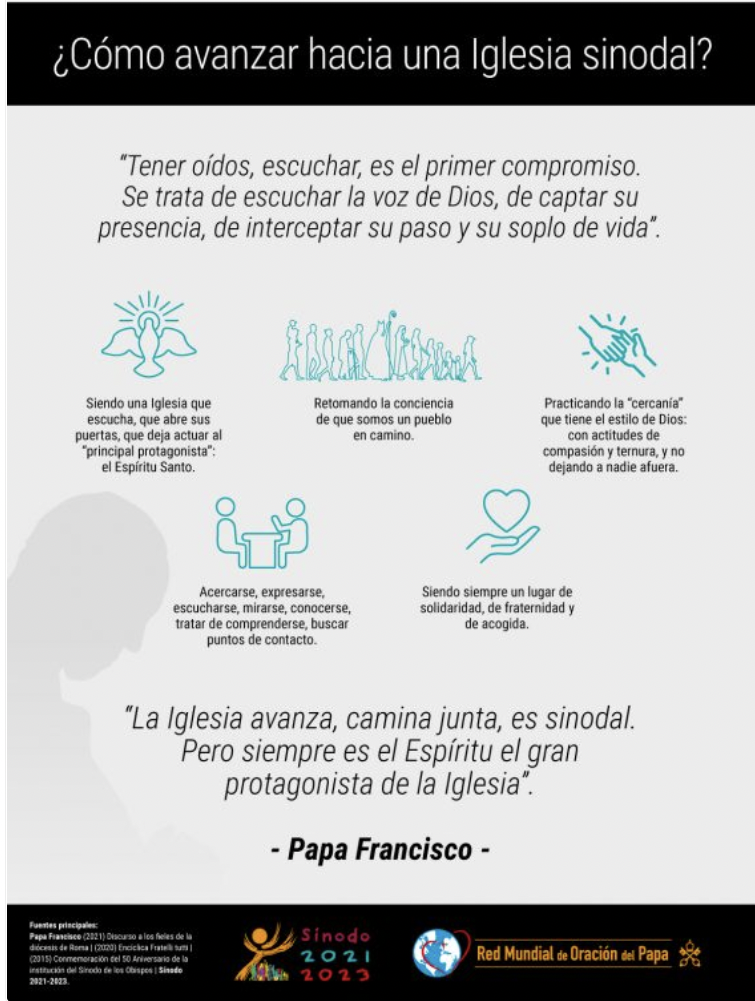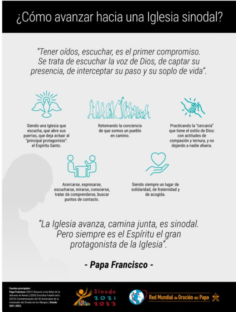 El P. Frédéric Fornos S.J., Director Internacional de la Red Mundial de Oración del Papa, agregó que el Papa Francisco ha iniciado un ciclo de catequesis sobre el discernimiento. “No tiene que sorprendernos, que en este mes en el cual celebramos un año del inicio del camino sinodal, y en el cual Francisco nos invita a rezar por una Iglesia abierta a todos, nos ayude a entender lo que significa discernir. Para que el camino sinodal en curso sea un verdadero proceso espiritual requiere escucha, diálogo, oración y discernimiento. No hay discernimiento sin oración. Sin oración se pueden compartir bonitas reflexiones y experiencias, pero difícilmente estar a la escucha del Espíritu Santo, actor principal del Sínodo. Recordemos pues, como dice Francisco, que ‘sin oración, no habrá Sínodo’”.