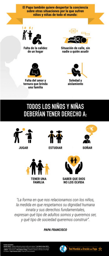 - Cada niño tiene derecho a jugar, a estudiar y a soñar, y el Santo Padre pide asumir responsabilidades y no olvidar que se trata de “seres humanos con un nombre, con un rostro propio, con una identidad que Dios les ha dado”.