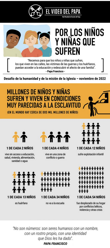 (Ciudad del Vaticano, 31 de octubre de 2022) – Despierta noviembre y con el nuevo Video del Papa, que comparte la intención de oración que el Santo Padre confía a toda la Iglesia Católica a través de la Red Mundial de Oración del Papa. Este mes, las palabras de Francisco van dirigidas a los más pequeños, los niños y niñas que son olvidados, que sufren a diario el rechazo, la indigencia, la pobreza y todo tipo de conflicto, sin una oportunidad real de crecimiento y desarrollo y sin acceder a derechos básicos. Son “condiciones muy parecidas a la esclavitud”, clama el Papa al referirse a los millones de niños y niñas que sufren bajo estas circunstancias, bajo un “sistema que los adultos hemos construido”.