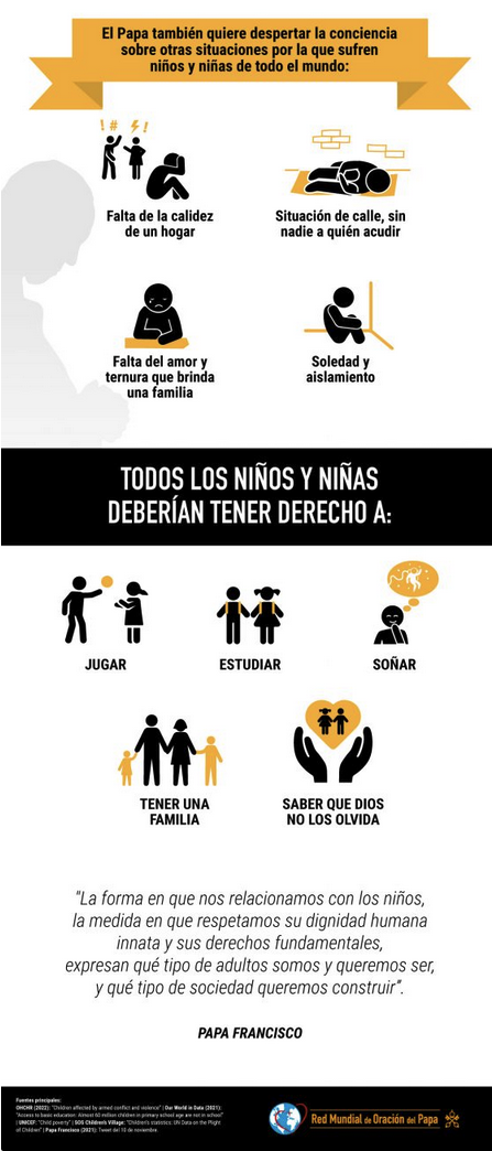 - Cada niño tiene derecho a jugar, a estudiar y a soñar, y el Santo Padre pide asumir responsabilidades y no olvidar que se trata de “seres humanos con un nombre, con un rostro propio, con una identidad que Dios les ha dado”.