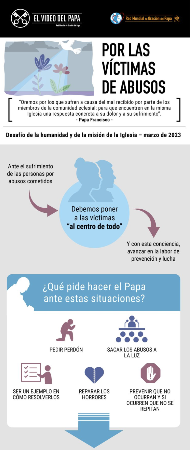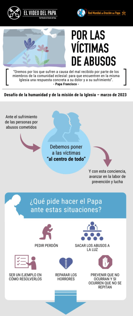 El P. Frédéric Fornos S.J., Director Internacional de la Red Mundial de Oración del Papa, comentó acerca de esta intención de oración: “En el Evangelio, Jesús, hablando desde lo más profundo de su corazón, dice: ‘Pero el que escandalice a uno de estos pequeños que creen en mí, más le valdría que le colgasen al cuello una piedra de molino y lo arrojasen al fondo del mar’ (Mt 18, 6-7). El sufrimiento de Jesús ante lo intolerable. Es difícil encontrar palabras ante la aberración. ‘Cuando experimentamos la desolación causada por estas heridas eclesiales, con María nos conviene dar más tiempo a la oración (San Ignacio de Loyola, Ejercicios espirituales, 319)’ recuerda el Papa Francisco en su ‘Carta al Pueblo de Dios’ (2018). El Papa deseó que la Iglesia católica rece durante todo el mes de marzo por las víctimas de abusos de poder y de conciencia, y de abusos sexuales, para ‘despertar nuestra conciencia, solidaridad y compromiso con una cultura de la protección’ y luchar con determinación contra todo tipo y forma de abuso. Este espacio de oración puede llevar a reflexionar sobre las causas estructurales e ideológicas que han producido estos abusos y su invisibilización. La oración abre el corazón, permite escuchar y ver, y lleva a actuar contra estos crímenes que desfiguran el Evangelio de Jesucristo y el rostro de la Iglesia, para que podamos encontrar, como expresa la intención de oración del Papa, respuestas concretas al dolor y al sufrimiento de las víctimas”.