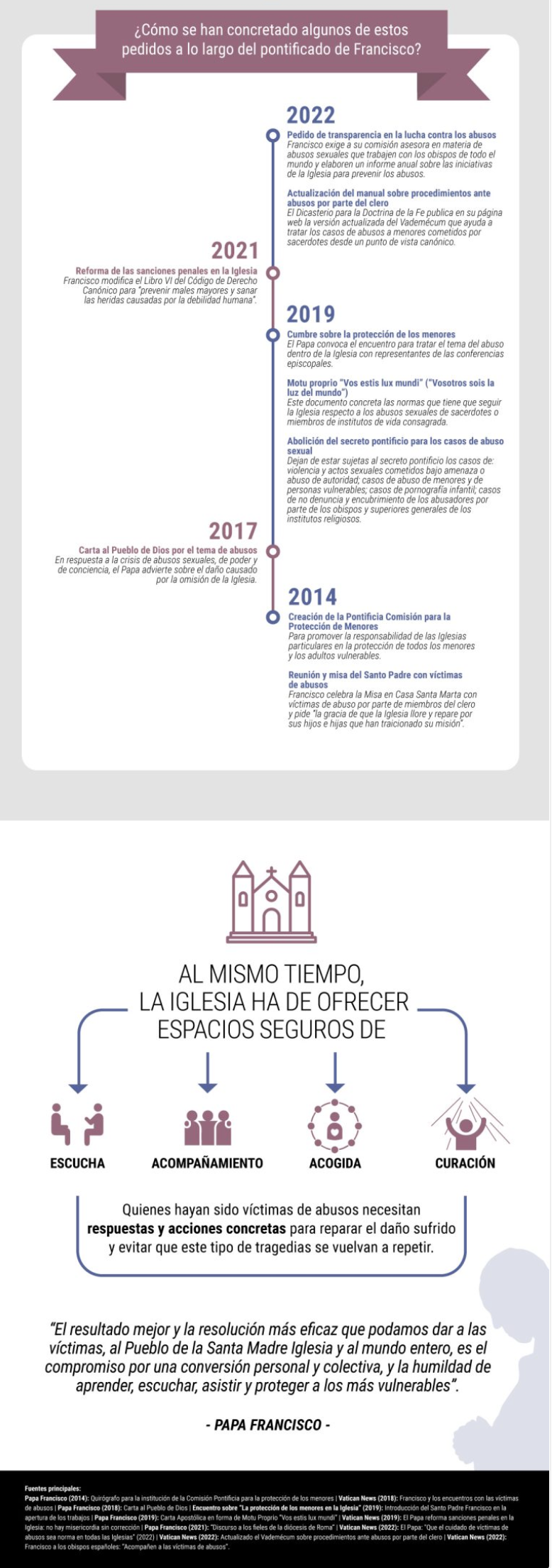 Resulta fundamental, sigue explicando Francisco, que la Iglesia ofrezca “espacios seguros para escuchar a las víctimas, acompañarlas psicológicamente y protegerlas”.
