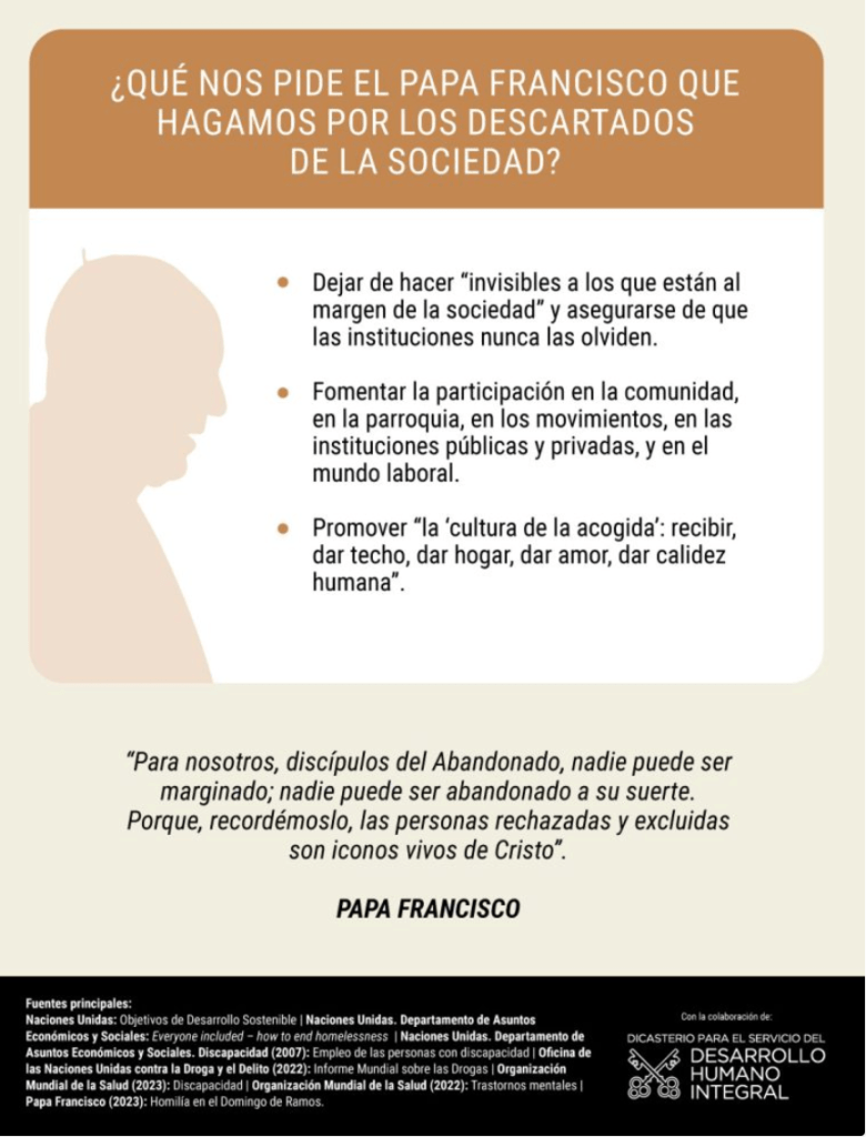 - “Por favor”, implora el Papa, “dejemos de hacer invisibles a los que están al margen de la sociedad, ya sea por motivos de pobreza, dependencias, enfermedades psíquicas o minusvalías”.