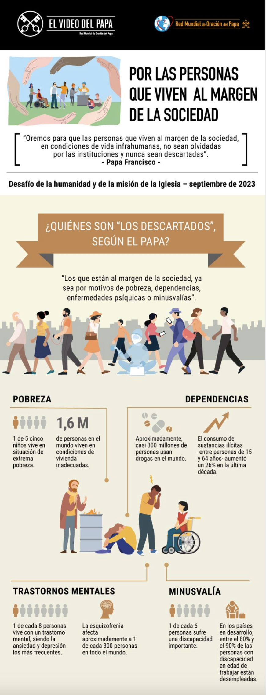 - En el Video del Papa del mes de septiembre, Francisco pide orar para que “las personas que viven al margen de la sociedad, en condiciones de vida infrahumanas, no sean olvidadas por las instituciones y nunca sean descartadas”.