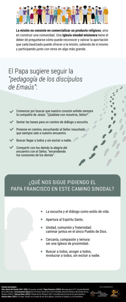 - El camino del Sínodo, remarca Francisco, se basa en la oración y el discernimiento, y la dimensión sinodal está estrechamente vinculada a la vocación misionera, porque “la misión está en el corazón de la Iglesia”.
