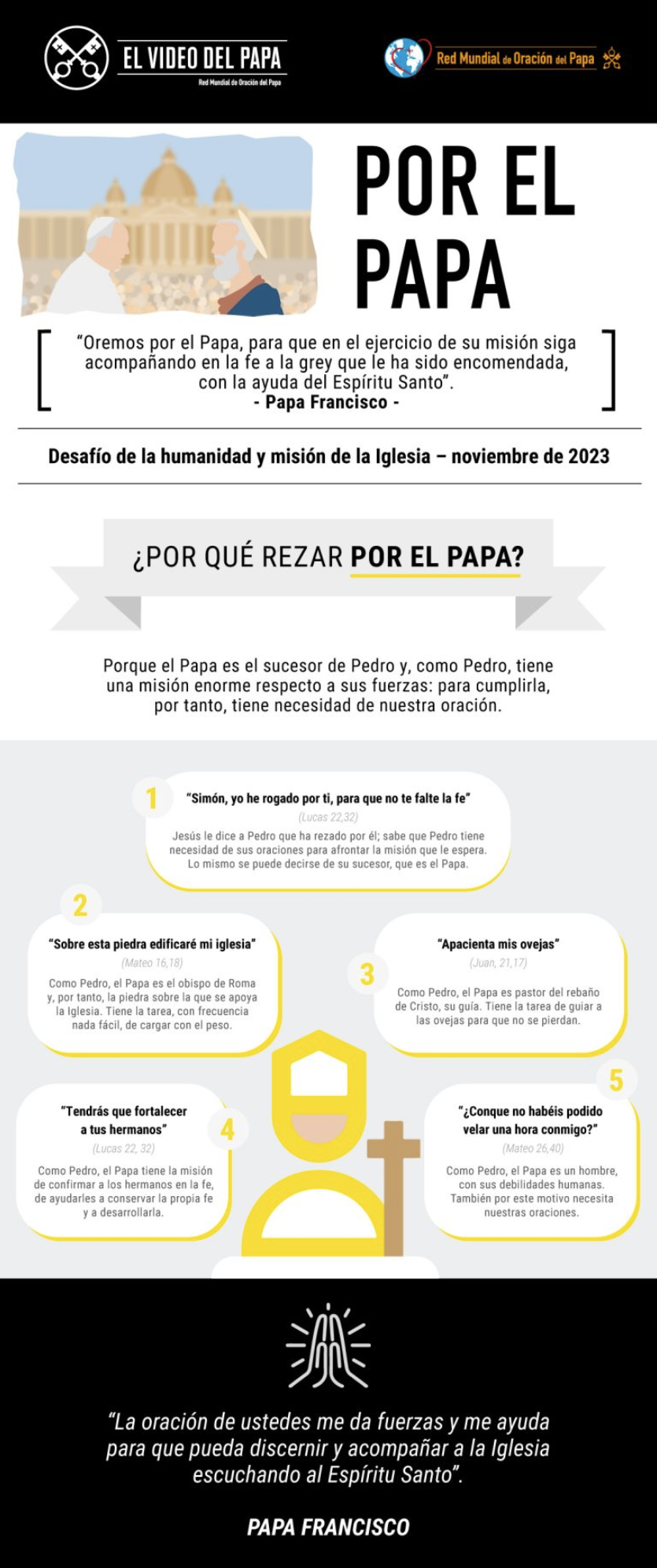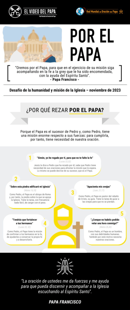 Según la tradición del Apostolado de la Oración (antiguo nombre de la Red Mundial de Oración del Papa), los Papas encomiendan desde 1879 una intención de oración cada mes a la Iglesia, a través de la Red Mundial de Oración del Papa. En este mes, la intención es la siguiente: “Oremos por el Papa, para que en el ejercicio de su misión siga acompañando en la fe a la grey que le ha sido encomendada por Jesús y siempre con la ayuda del Espíritu Santo”. El Papa concluye el vídeo con una pizca de humor: “Recen por mí. ¡A favor!”.