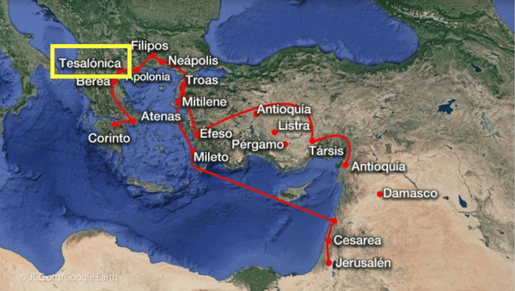 Tesalónica era un importante puerto marítimo, al este de Grecia, con una población diversa y próspera. Las excavaciones arqueológicas han encontrado no sólo los restos de una sinagoga, sino también santuarios egipcios y romanos. Según Lucas, escribiendo en los Hechos de los Apóstoles (17, 1–9), Pablo visitó Tesalónica durante su segundo viaje misionero con Silvano. Él se quedó aquí varias semanas, pero se vio obligado a abandonar el lugar debido a los disturbios.
