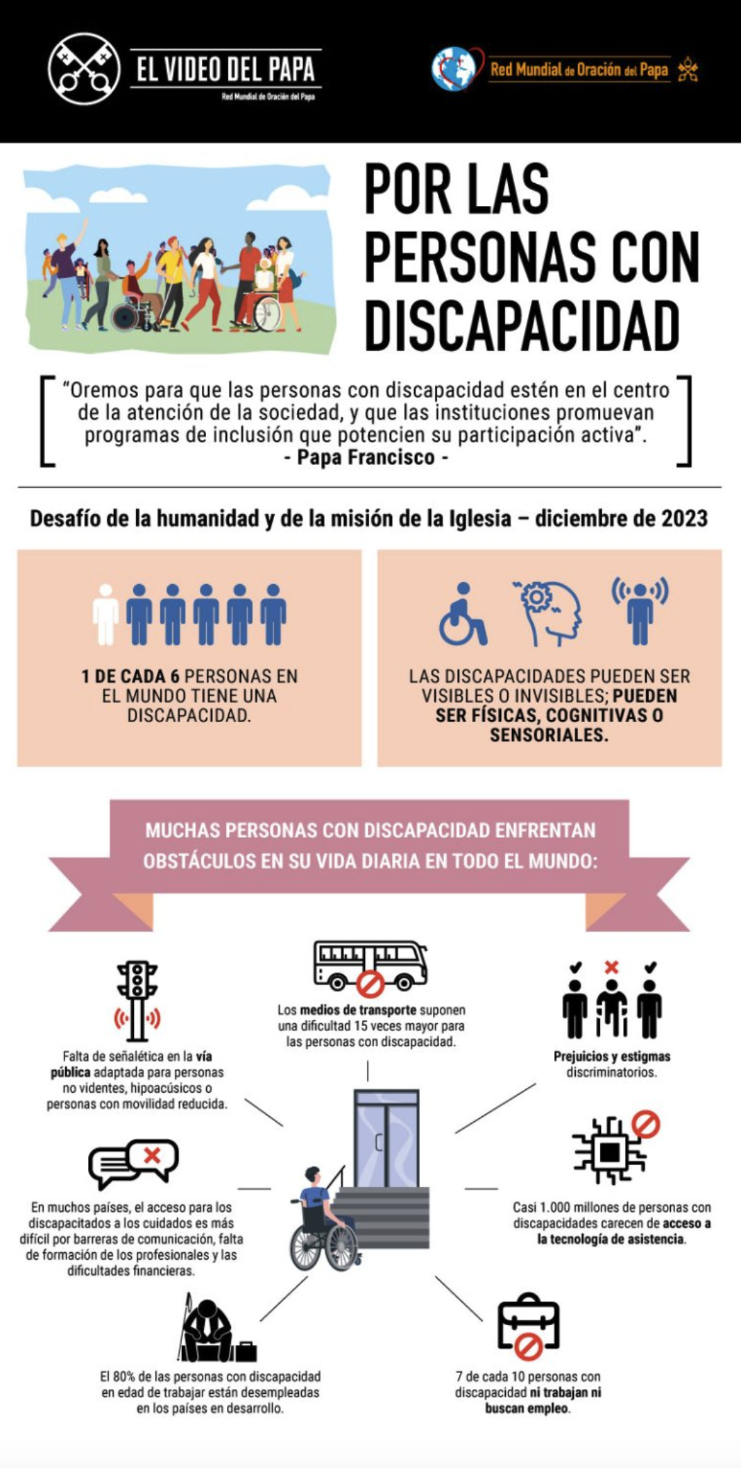 Esta intención de oración coincide con el mes en el que la ONU estableció el Día Internacional de las Personas con Discapacidad (3 de diciembre) con el objetivo de promover sus derechos y bienestar. El Papa Francisco insiste en el concepto de “capacidades diferentes” para subrayar la gran contribución que puede aportar a la sociedad, la plena inclusión y valorización de los más frágiles.