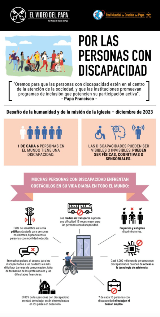 (Ciudad del Vaticano, 28 de noviembre de 2023) – “Hacen falta programas, iniciativas que favorezcan la inclusión”, dice Francisco en la edición del mes de diciembre de El Video del Papa en el cual llama a rezar por las personas con discapacidad. A través de la Red Mundial de Oración del Papa, el Santo Padre pide “para que las personas con discapacidad estén en el centro de la atención de la sociedad, y que las instituciones promuevan programas de inclusión que potencien su participación activa”.
