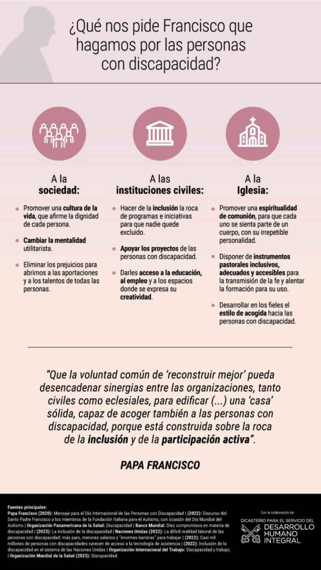 - Francisco, además, llama a las instituciones a que promuevan “programas de inclusión que potencien” la participación activa de las personas con discapacidad.