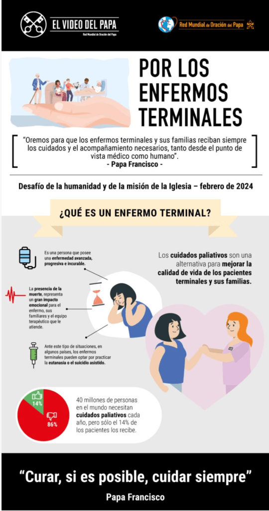 El Padre Frédéric Fornos S.J., Director Internacional de la Red Mundial de Oración del Papa, presente en 89 países, con más de 22 millones de católicos, pregunta: “¿Para qué sirve rezar por esta intención? ¿No sería suficiente que el Papa hiciera una declaración sobre este tema? ¿Realmente cambia algo rezar? Son preguntas que quizás nos planteemos.” El P. Fornos continua: “Cuando la enfermedad llama a la puerta de nuestra vida, siempre aflora en nosotros la necesidad de tener cerca a alguien que nos mire a los ojos, que nos tome de la mano, que manifieste su ternura y nos cuide, como el Buen Samaritano de la parábola evangélica. Esta cercanía y cariño con las personas en fase terminal podría parecer accesorio y secundario respecto al acompañamiento médico, al igual que puede parecerlo la oración; sin embargo, este apoyo es esencial. Es el amor que se expresa a través de estos gestos y nuestra oración. En esos momentos difíciles, las familias tienen un papel decisivo, dice Francisco. Oremos, pues, para que los enfermos terminales y sus familias reciban siempre los cuidados y el acompañamiento necesarios”.