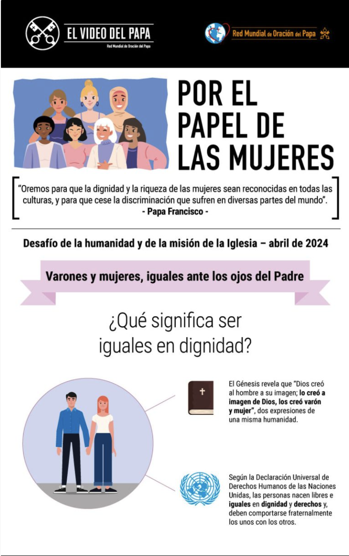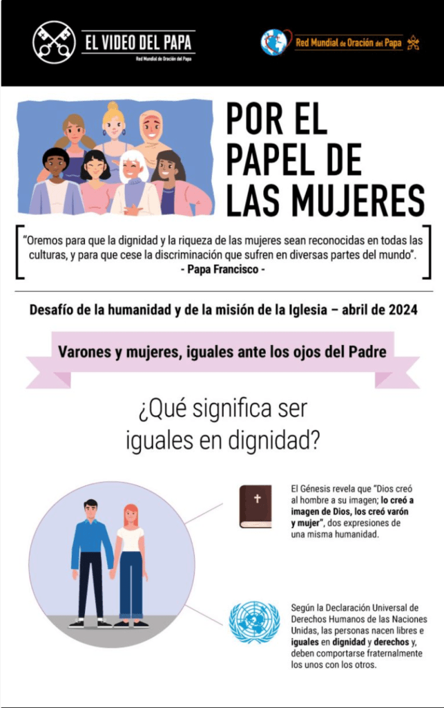 (Ciudad del Vaticano, 2 de abril 2024) – En El Video del Papa de abril, que confía a la Red Mundial de Oración del Papa, “para que la dignidad y la riqueza de las mujeres sean reconocidas en todas las culturas, y para que cese la discriminación que sufren en diversas partes del mundo”.