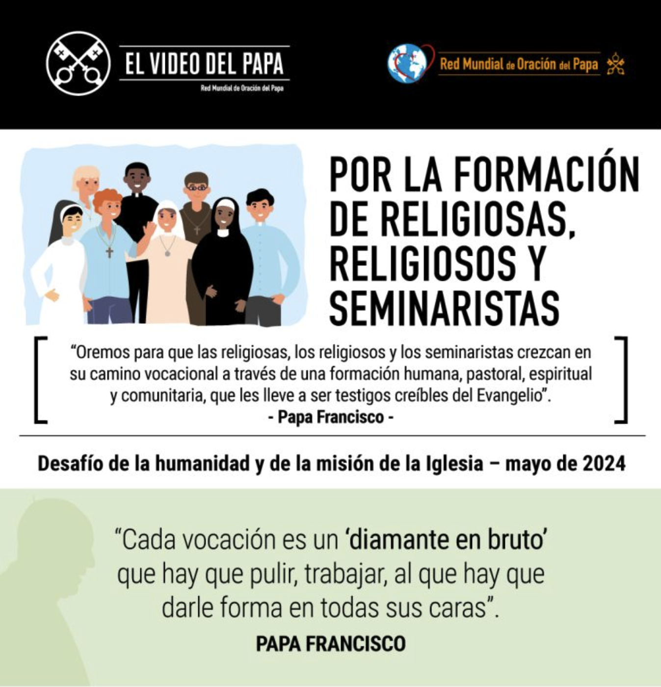 - En El Video del Papa de mayo, Francisco eleva su oración “para que las religiosas, los religiosos y los seminaristas crezcan en su camino vocacional a través de una formación humana, pastoral, espiritual y comunitaria, que los lleve a ser testigos creíbles del Evangelio”.