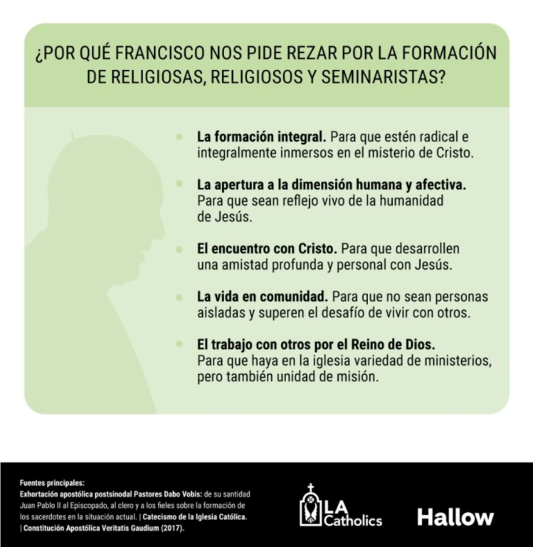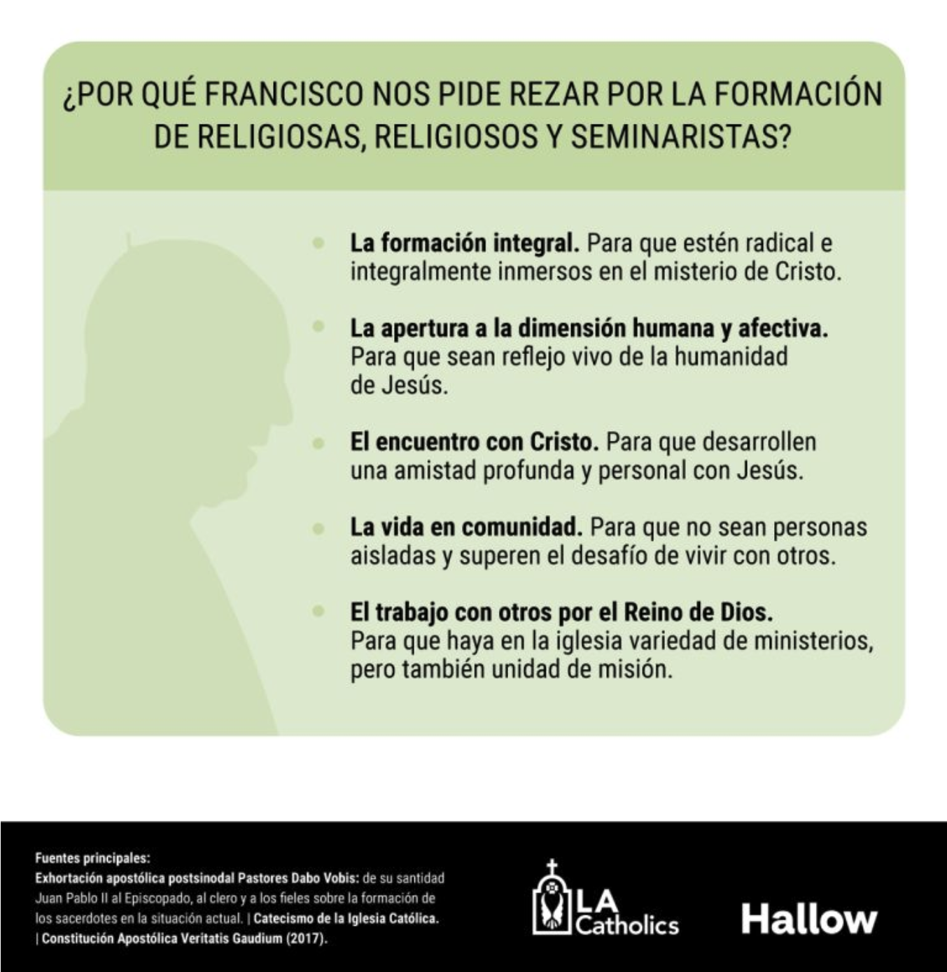 El Video del Papa de este mes también ha recibido el apoyo de Hallow, una aplicación de oración nacida en Estados Unidos. Su cofundador, Alessandro DiSanto, comenta: “Es un verdadero honor y una bendición poder apoyar al Santo Padre y la iniciativa El Video del Papa. Como aplicación centrada en ayudar a personas de todo el mundo a encontrar paz y propósito en su relación personal con Dios, estamos especialmente emocionados de patrocinar este video sobre la formación de religiosos y religiosas, así como de seminaristas. Estamos increíblemente en deuda con estos hombres y mujeres que han aceptado heroicamente sus vocaciones religiosas, desde los sacerdotes que llegan a los fieles con los sacramentos hasta las religiosas que sirven a nuestra Iglesia de tantas maneras sacrificadas. Nuestra sincera esperanza es que este video suscite un compromiso renovado de apoyo a quienes disciernen o viven una vocación religiosa, que de un modo único, sirven como manos de Cristo en la tierra”.