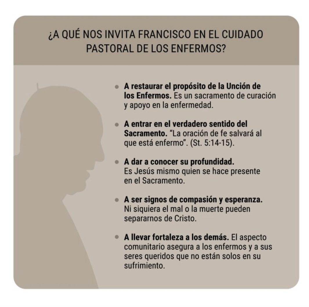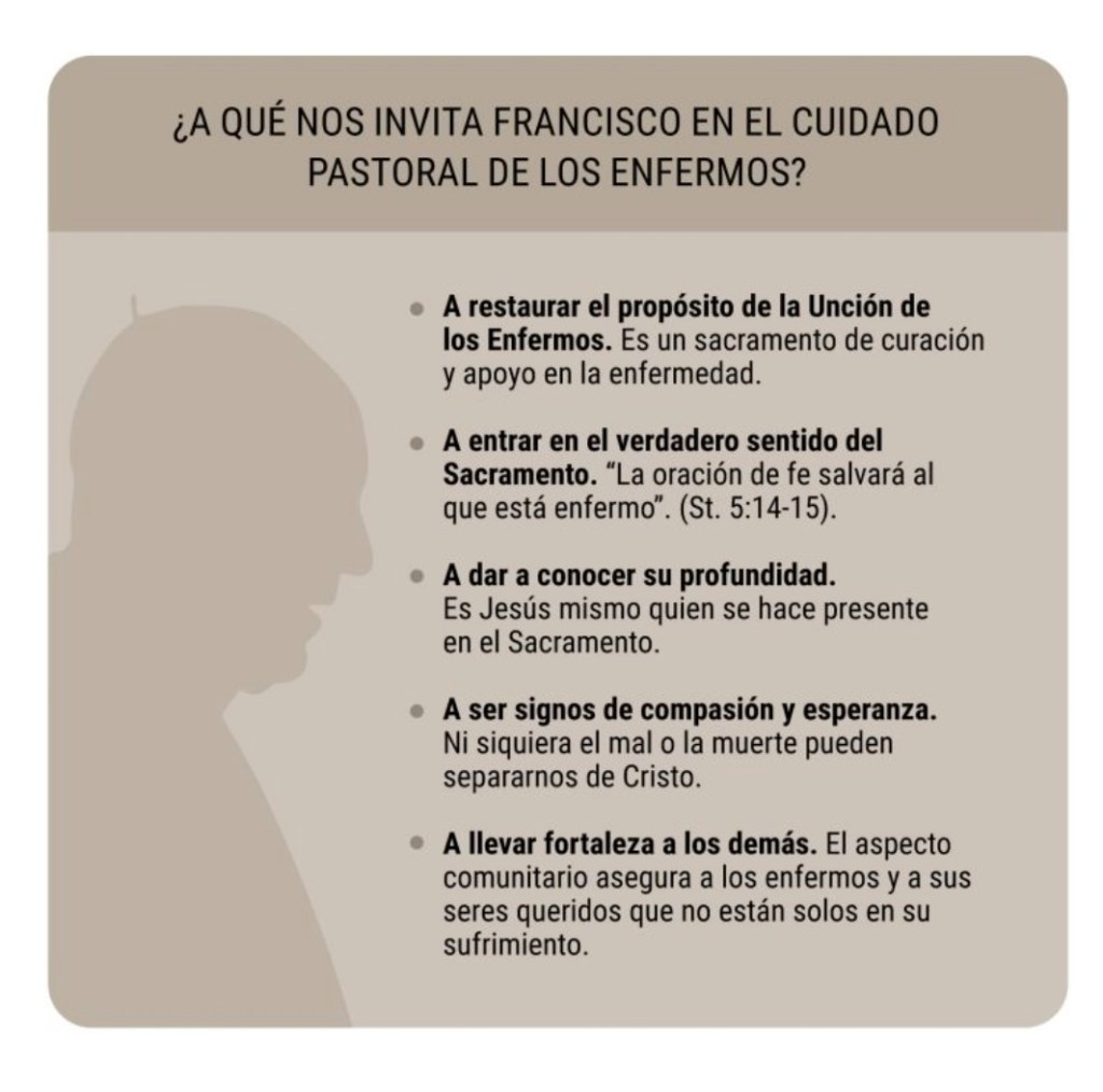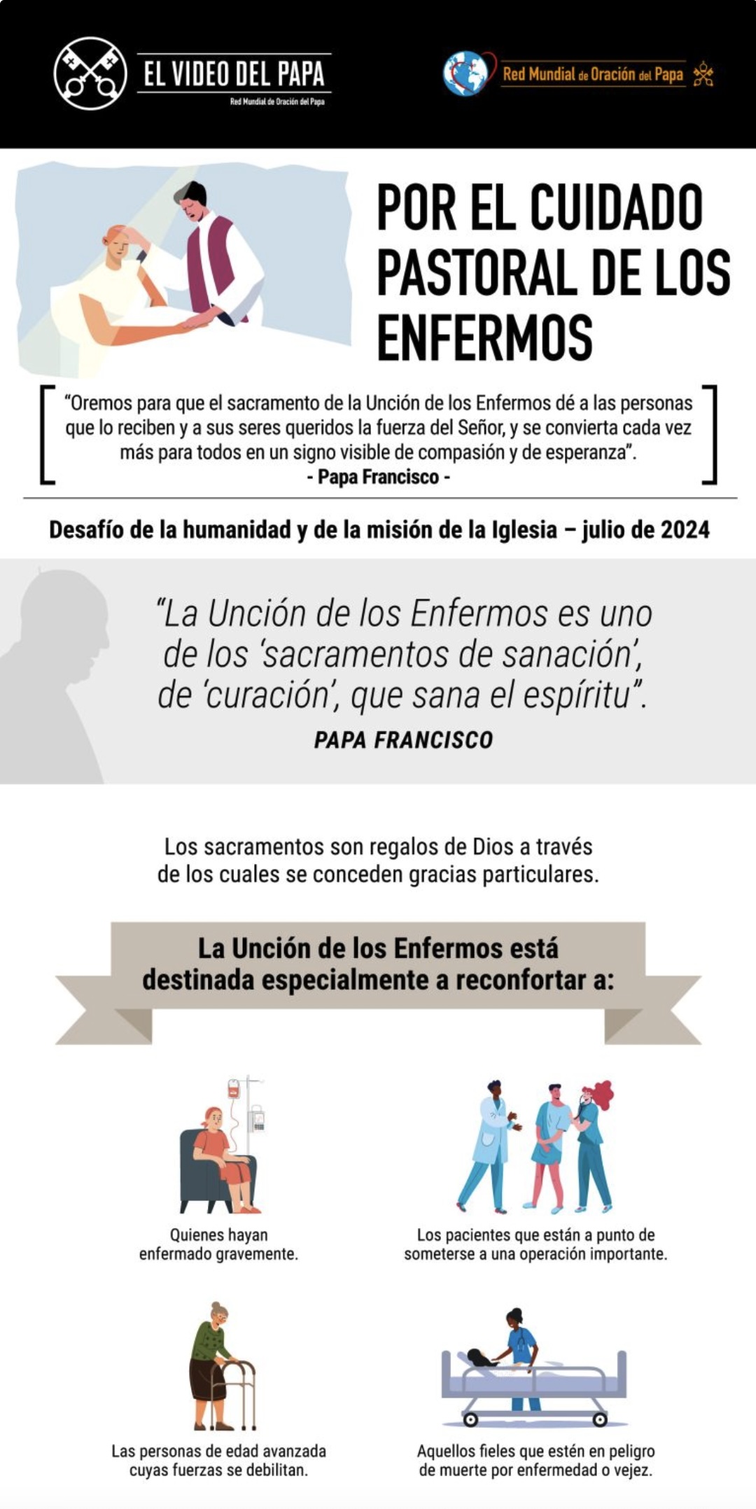 El Padre Frédéric Fornos S.J., Director Internacional de la Red Mundial de Oración del Papa, destaca que aunque muchos hayan redescubierto la profundidad del Sacramento de la Unción de los Enfermos, todavía se entiende a menudo como una forma de preparar a los enfermos para la muerte. “Esto es lo que dice Papa Francisco cuando recuerda que, cuando alguien está gravemente enfermo, queremos postergar siempre más el Sacramento de la Unción de los Enfermos, pues persiste la idea de que los sepultureros llegan después del sacerdote (Audiencia general del 26 de febrero de 2014). Por eso, Papa Francisco desea que este mes podamos redescubrir toda la profundidad y el verdadero sentido de este sacramento, no solo como una preparación para la muerte, sino como un sacramento que ofrece consuelo a los enfermos en tiempos de enfermedad grave, a sus seres queridos y fuerza a quienes los cuidan”.