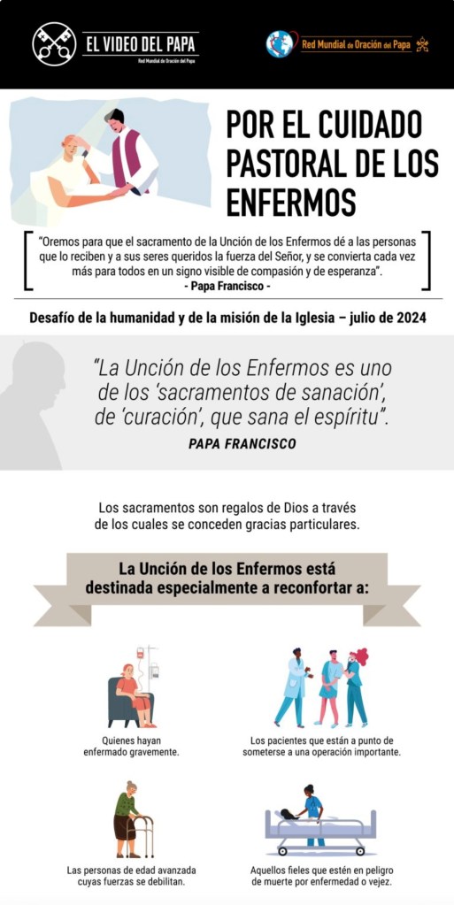 - En El Video del Papa de julio, Francisco eleva su oración para que el sacramento de la Unción de los Enfermos se convierta cada vez más en un “signo visible de compasión y de esperanza”.