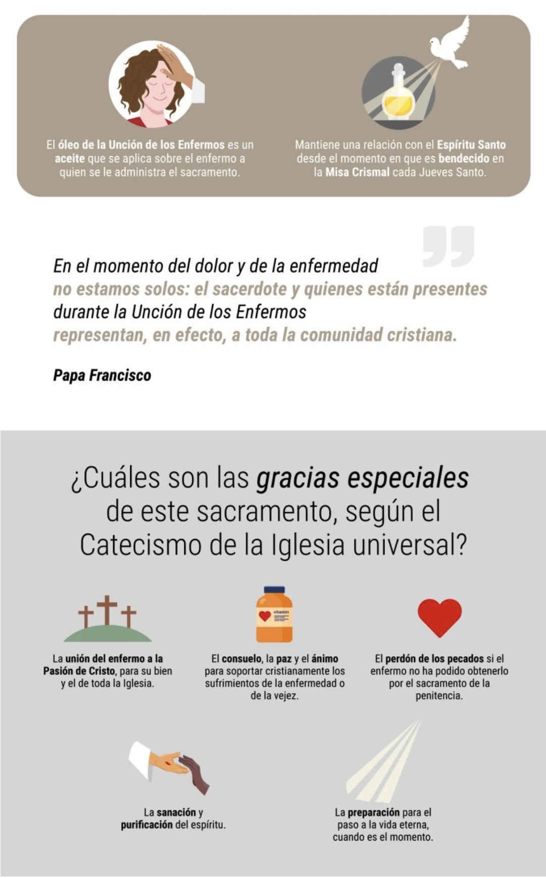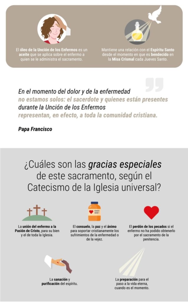 “En el momento del dolor y de la enfermedad no estamos solos: el sacerdote y quienes están presentes durante la Unción de los enfermos representan, en efecto, a toda la comunidad cristiana que, como un único cuerpo nos reúne alrededor de quien sufre y de los familiares, alimentando en ellos la fe y la esperanza, y sosteniéndolos con la oración y el calor fraterno”, afirmó el Papa ante miles de fieles en una audiencia general en febrero de 2014, dedicada a este sacramento.