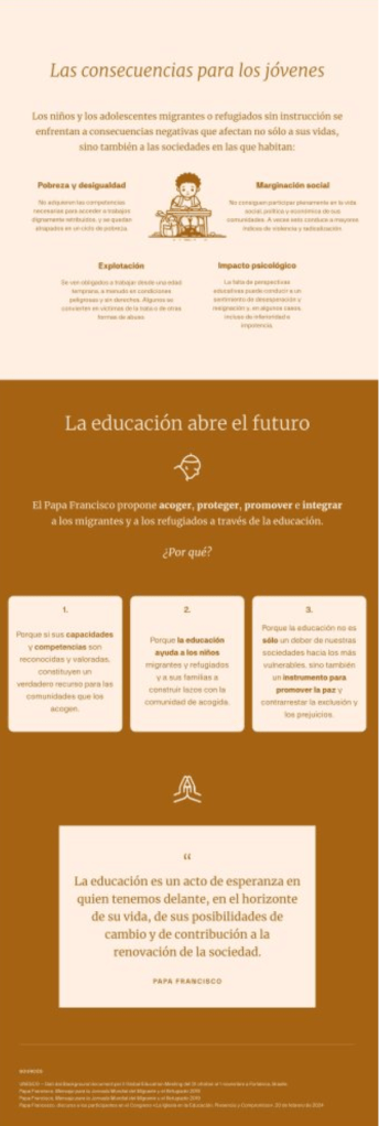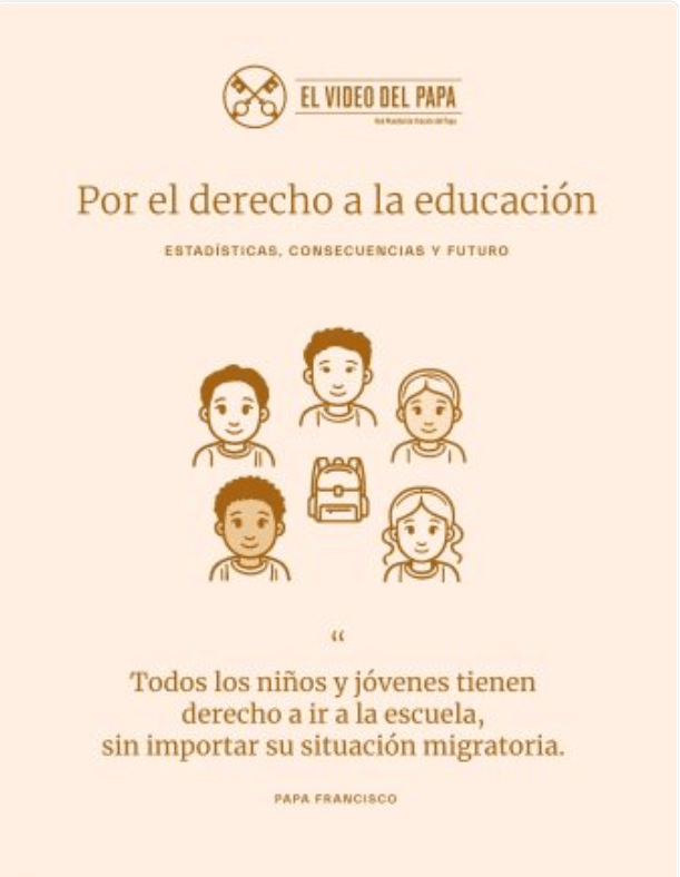 Además, cuando los niños y jóvenes se trasladan a otros países o regiones, su estatus migratorio puede impedirles acceder a la educación y, por consiguiente, a un futuro mejor. Por eso, el Papa Francisco afirma en el video que “todos los niños y jóvenes tienen derecho a ir a la escuela, sin importar su situación migratoria”. En ocasiones anteriores, el Pontífice ha pedido que se asegure a los migrantes y refugiados “el acceso regular a la educación primaria y secundaria”, así como “la permanencia regular al cumplir la mayoría de edad y la posibilidad de continuar sus estudios”[3].
