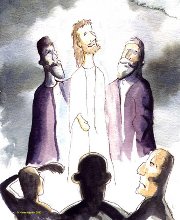 Moisés, el gran legislador del pueblo de Israel, y Elías, el mayor de los los profetas, representan la totalidad del Antiguo Testamento. Ellos indican que el propósito de la Ley y los Profetas, en la preparación para Cristo, se ha cumplido. Según la tradición bíblica, ambos hombres habían sido llevados al cielo. Asimismo, dos hombres también «aparecen de repente» en el momento de la resurrección de Jesús (Lucas 24, 4) y Ascensión (Hechos 1, 10).