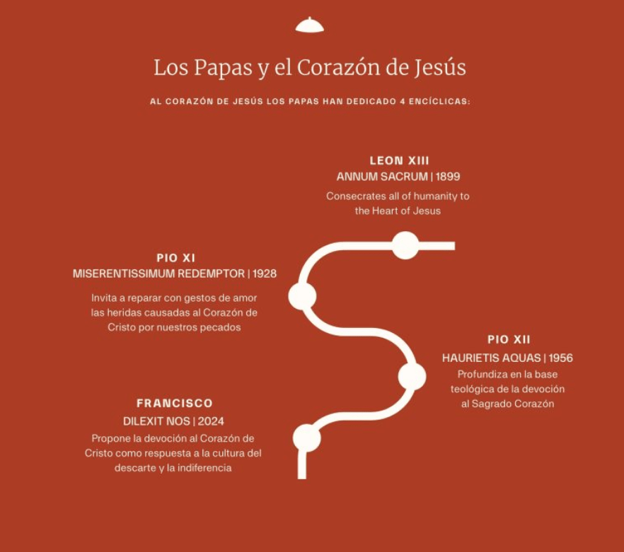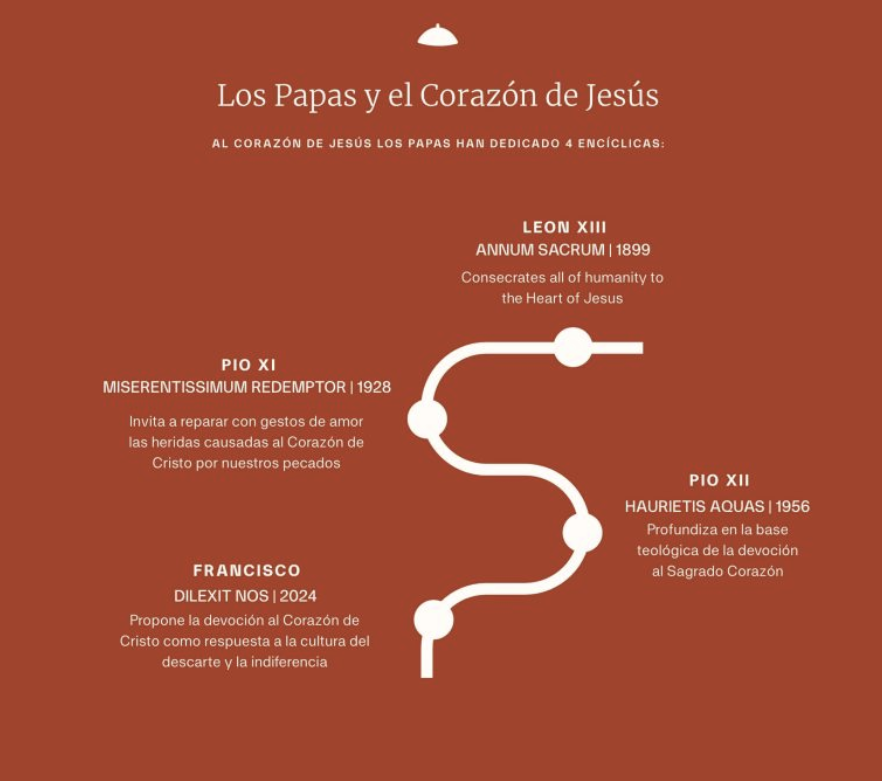 Buena muestra de la relevancia del Sagrado Corazón en la vida de la Iglesia se encuentra tanto en la devoción popular como en el hecho de que cuatro Papas le han dedicado una encíclica. León XIII, de quien el actual Pontífice ha tomado el nombre, escribió la Annum sacrum en 1899; en ella, consagra toda la humanidad al Corazón de Jesús. En 1928, Pío XI, en la Miserentissimum Redemptor, invita a reparar con gestos de amor las heridas causadas al Corazón de Cristo por nuestros pecados. Por su parte, Pío XII, en 1956, publica la Haurietis aquas, en la que profundiza en la base teológica de la devoción al Sagrado Corazón. Finalmente, el Papa Francisco, en 2024, escribe Dilexit nos y propone la devoción al Corazón de Cristo como respuesta a la cultura del descarte y la indiferencia.