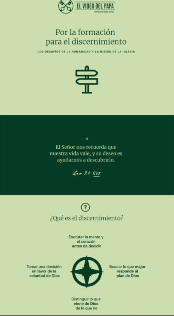 (Ciudad del Vaticano, 3 de julio de 2025). – Hoy se publica la nueva edición de El Video del Papa, que acompaña e ilustra la intención de oración de León XIV para el mes de julio. Dicha intención, que el Pontífice confía a su Red Mundial de Oración, está dedicada a la formación para el discernimiento. León XIV la formula así: “Oremos para que aprendamos cada vez más a discernir, saber elegir caminos de vida y rechazar todo lo que nos aleje de Cristo y del Evangelio”.