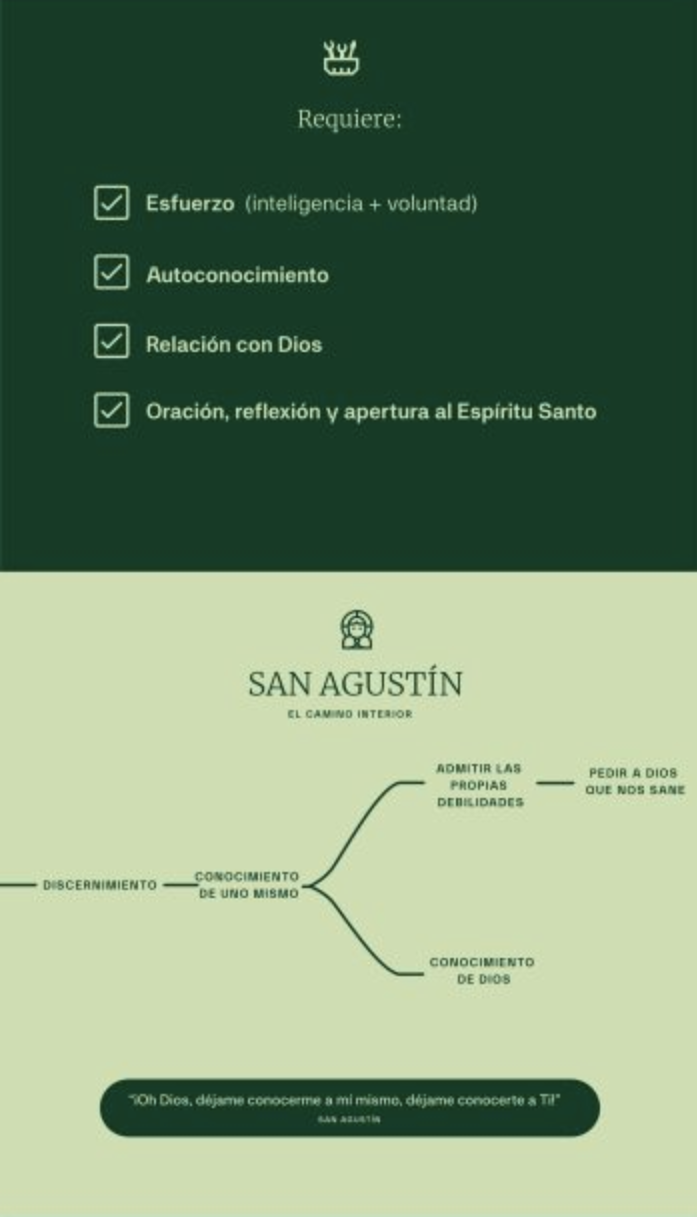 En la oración del Papa se advierte el eco de la famosa súplica de San Agustín en las Confesiones: “¡Oh Dios, déjame conocerme a mí mismo, déjame conocerte a Ti!”. Podemos decir brevemente que, según Agustín, el conocimiento de uno mismo lleva al conocimiento de Dios: para discernir, es preciso situarse en la verdad ante Dios, entrar en uno mismo, admitir las propias debilidades y pedir al Señor que nos sane. A partir de ahí, se puede renacer a través de una auténtica relación con Dios.