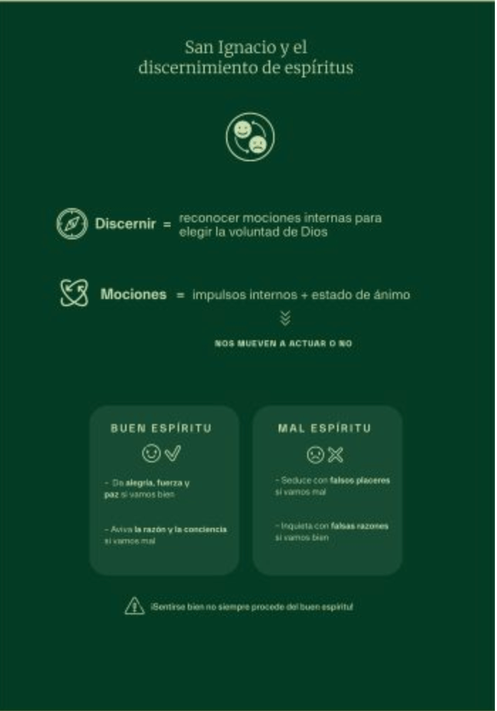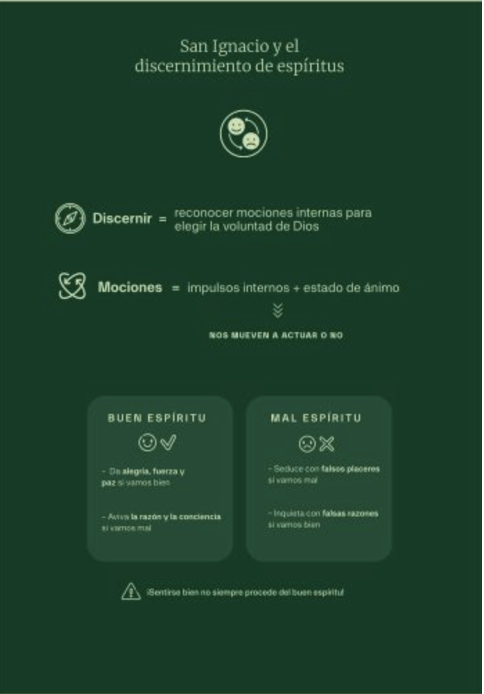 “San Ignacio nos ofrece unas reglas de discernimiento para sentir y conocer lo que nos pasa interiormente, las mociones, los movimientos de nuestro espíritu, con el fin de que podamos elegir lo que nos ayuda a amar y ser amados, y rechazar lo que nos lo impide. El discernimiento espiritual nos ayuda a ejercer mejor nuestra libertad”.
