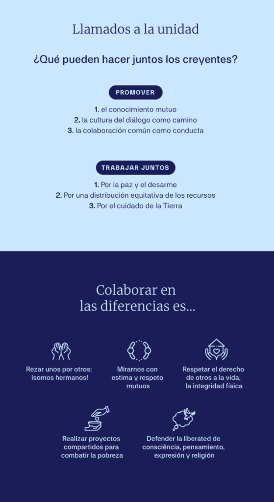 - En un tiempo marcado por los conflictos, el Papa invita a todos los creyentes a buscar lo que une, para “defender y promover la paz, la justicia y la fraternidad humana”.