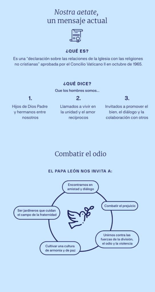 Hace diez años, en el 50º aniversario de Nostra Aetate, el Papa Francisco destacó su actualidad, recordando que el camino del diálogo requiere conocimiento, respeto y estima mutuos, y que el mundo pide a los creyentes respuestas eficaces sobre la paz, el hambre, la pobreza, la crisis medioambiental y la violencia, especialmente la cometida en nombre de la religión. En ese contexto, el Papa subrayó también que los creyentes no tienen “recetas” para todos los problemas, pero sí un gran recurso: la oración, nuestro tesoro del que nos servimos según nuestras respectivas tradiciones.